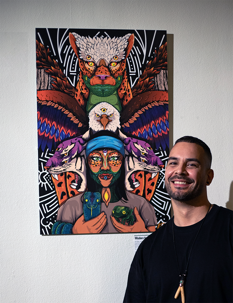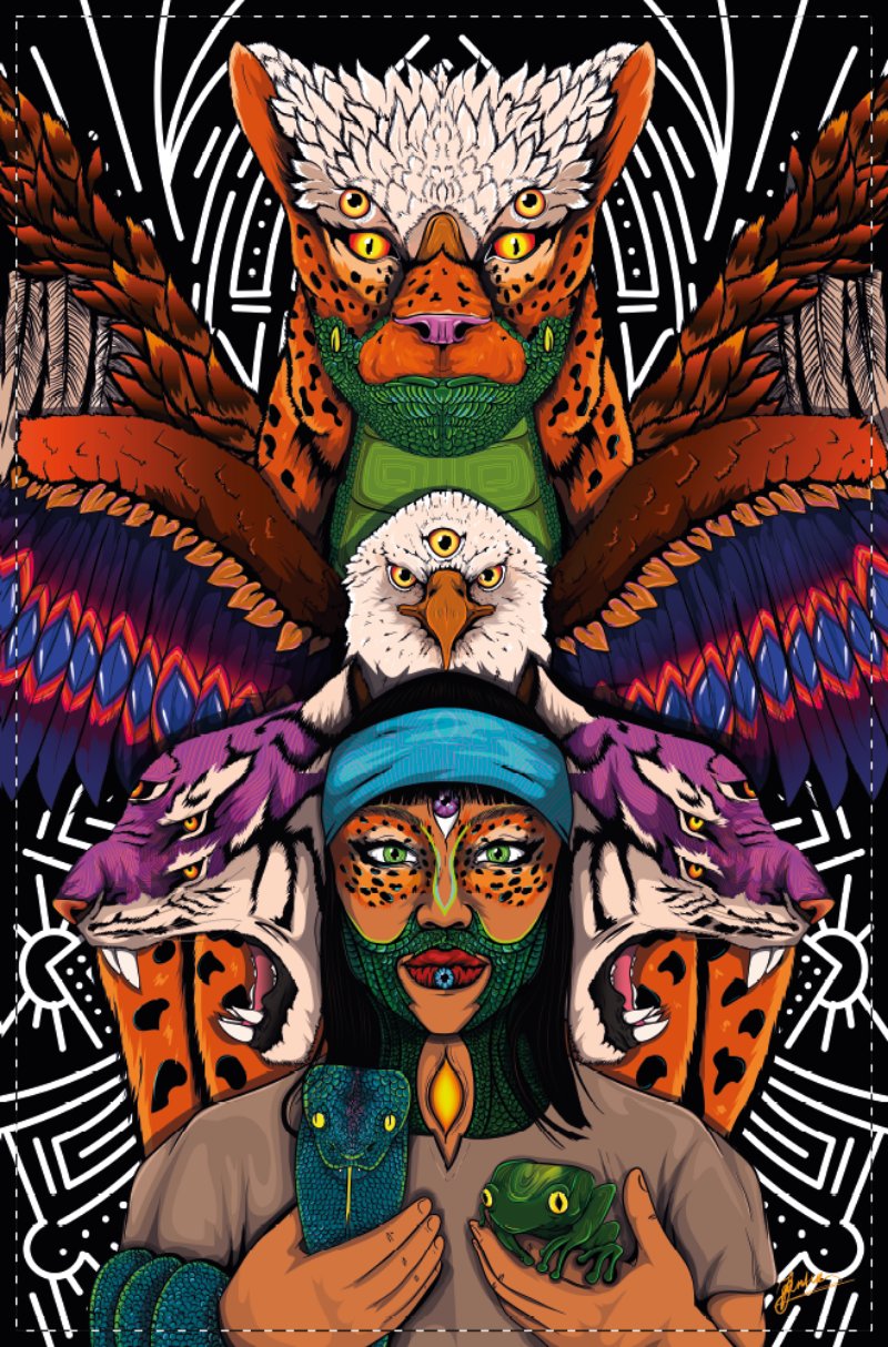 The rich stories from the Amazon serve as inspiration. The tiger symbolizes consciousness, the snake represents the subconscious, and the eagle stands for higher awareness. The hybrid creature unites all elements. The left hand holds the Kambo frog.